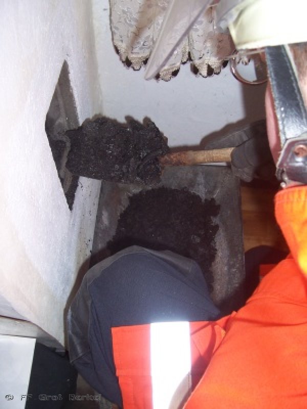 Trotzdem wurde vom Einsatzleiter entschieden, den Schornstein vorsorglich kehren zu lassen. Die KRL wurde daher gebeten den zuständigen Schornsteinfegermeister zu benachrichtigen. Bis zum Eintreffen sollten das TLF und der ELW noch vor Ort bleiben, die anderen Fahrzeuge konnten wieder einrücken.