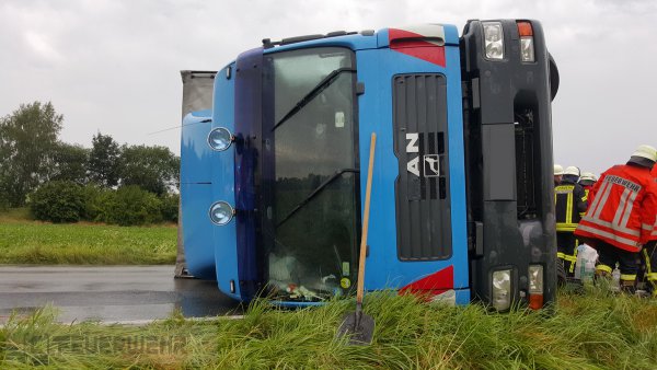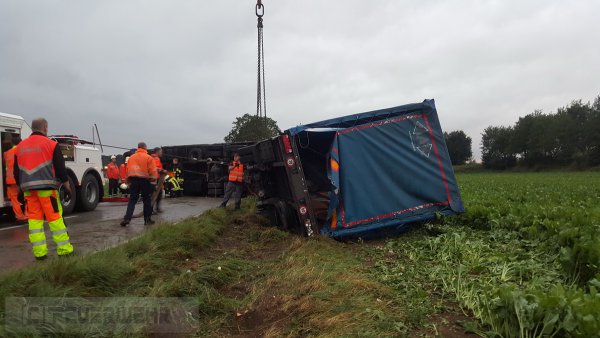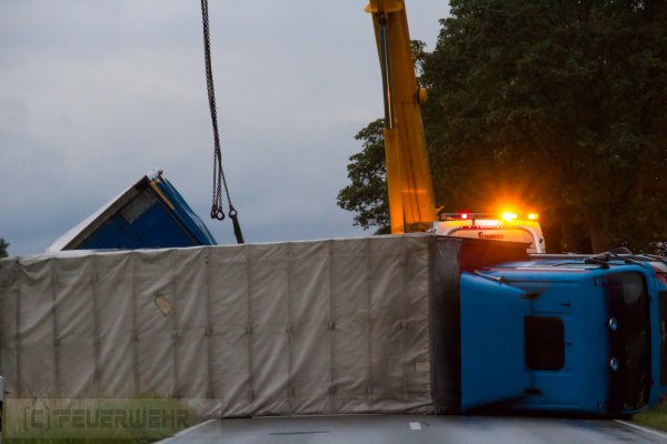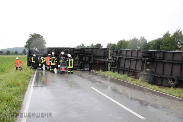 Ein LKW, der auf der Landesstraße 432 von Groß Berkel in Richtung Königsförde unterwegs war, kam aus noch ungeklärter Ursache kurz hinter dem Ortsausgang von Groß Berkel nach rechts von der Fahrbahn ab. Anscheinend versuchte der Fahrer noch, sein mit Möbeln beladenes Fahrzeug samt Anhänger wieder unter Kontrolle und auf die Straße zurück zu bringen. Doch dieser Versuch schlug fehl und sowohl Zugfahrzeug als auch Anhänger kippten auf die Beifahrerseite. Während der Anhänger dabei auf einem angrenzenden Feld liegen blieb rutschte der LKW quer über die Straße und versperrte diese dadurch komplett.