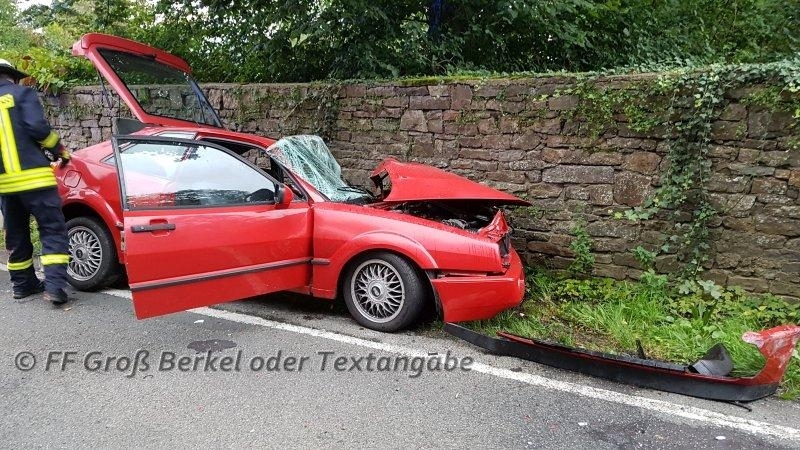 Ein in LKW-Fahrer hat einen am Straßenrand haltenden Müllwagen überholt. Während dieses Überholvorgangs kam ihm ein in Richtung Königsförde fahrender VW Corrado entgegen. Zwar ist der LKW wieder auf seine Fahrspur gewechselt, jedoch stieß der VW aus noch ungeklärter Ursache gegen den LKW, drehte sich und kam schließlich entgegengesetzt seiner Fahrtrichtung an der Schlossmauer zum Stehen. Der 22-jährige Fahrer wurde von Ersthelfern aus seinem Fahrzeug befreit und konnte so schnell dem Rettungsdienst übergeben werden.