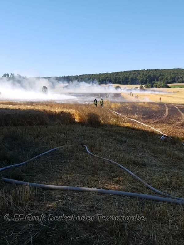 Vor Ort angekommen stellte sich heraus, dass ein teilweise bereits abgeerntetes Getreidefeld in Flammen stand. Nach Polizeischätzungen handelte es sich insgesamt um ca. 20.000 Quadratmeter Fläche! Da der Acker direkt an die Wohnbebauung grenzte wurden neben der eigentlichen Brandbekämpfung durch die zahlreich alarmierten Feuerwehren auch die Gebäude geschützt.