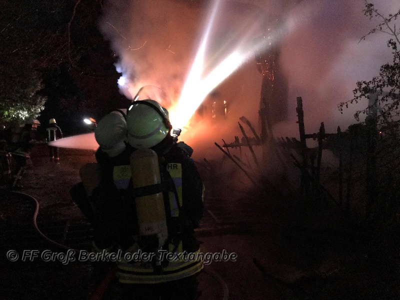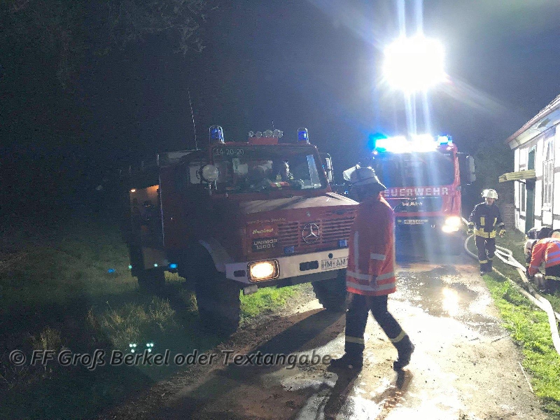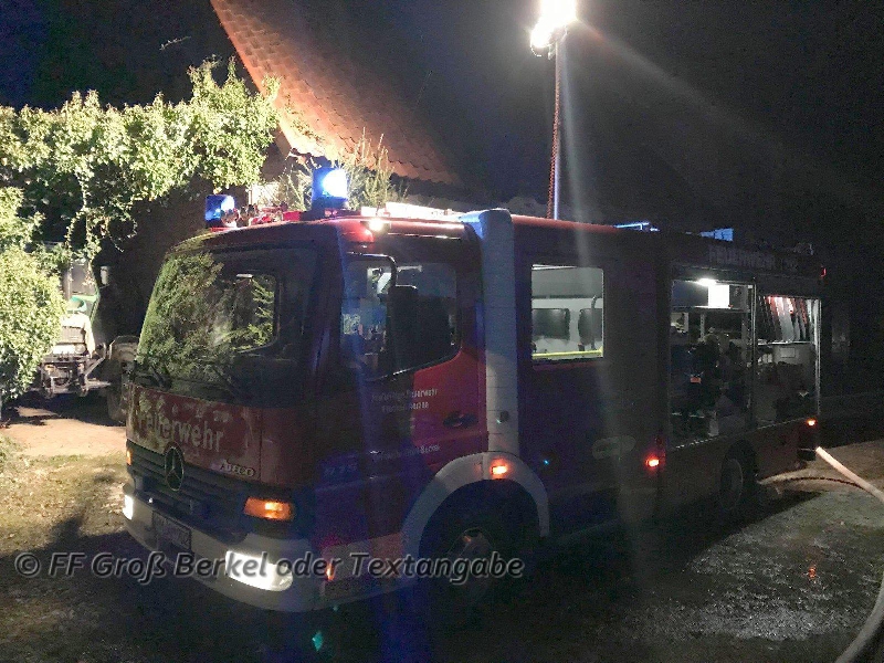 Nachdem genügend Kräfte am Feuerwehrhaus eingetroffen waren, rückte auch das LF zur Einsatzstelle aus. An der Einsatzstelle angekommen speiste das TLF zunächst das LF aus Reher mit Wasser, bevor es nach dem Auffüllen des Wassertanks erst einmal in Bereitstellung verblieb. Die Aufgabe der Löschgruppenbesatzung bestand darin, den Schuppenbrand von der Rückseite zu bekämpfen. Dies wurde durch einen Trupp unter Atemschutz durchgeführt. Nachdem der Trupp dieses erledigt hatte und die Atemluft aus den Behältern leer und der Brand soweit abgelöscht waren, konnten die Groß Berkeler Kräfte wieder in den Standort einrücken.