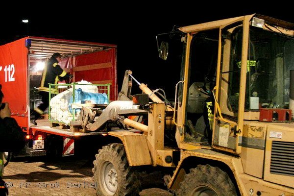 Feuerwehr und THW arbeiteten Hand in Hand: Während die Einsatzkräfte der Feuerwehr die Sandsäcke füllten und auf normalen Euro-Paletten stapelten, kümmerten sich die Helfer des THW mit einer Transportkomponente um das Verlasten der Paletten auf geländegängigen LKW (Unimog und MAN 7 to.) und den Transport zum Deich. An Ort und Stelle wurden die Sandsäcke dann wieder von Feuerwehrleuten in Empfang genommen und mit einer Menschenkette zu den acht Sickerstellen weitergereicht, wo sie unter fachkundiger Aufsicht verbaut wurden.