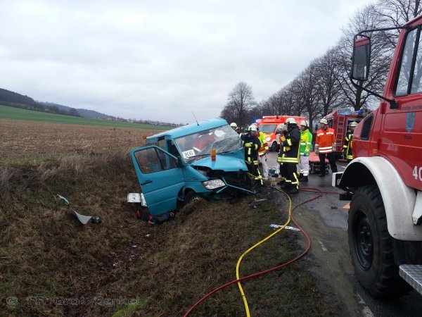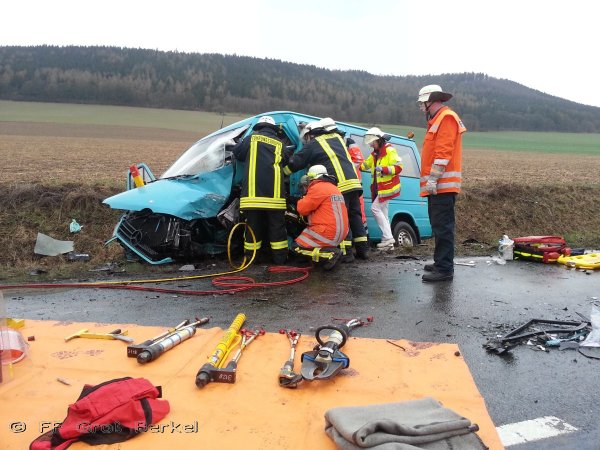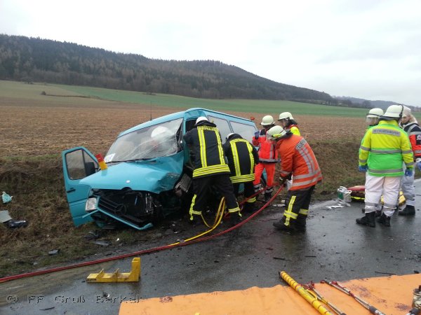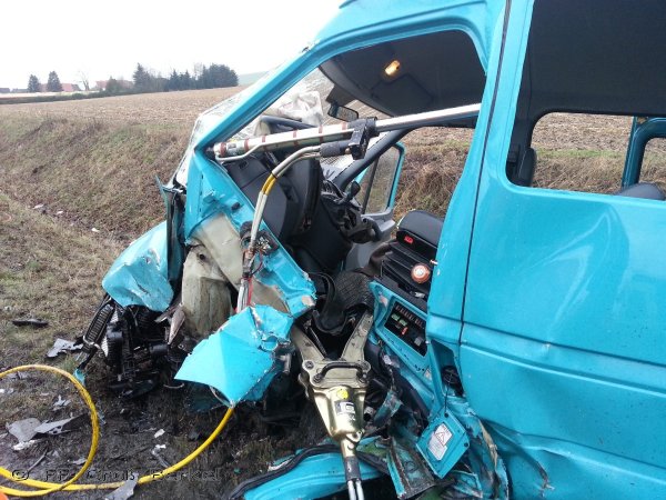 Die Befreiung der eingeklemmten Fahrerin gestaltete sich dann jedoch ein wenig schwieriger, da dass mittlerweile schon in die Jahre gekommene Hydraulikaggregat des Rettungssatzes aufgrund der stabilen Fahrgastzelle des Kleinbusses nahezu an seine Grenzen gestoßen ist. Doch glücklicherweise hat die Leistung dann doch noch ausgereicht und die Fahrerin konnte somit dann an den Rettungsdienst übergeben werden. Sie wurde dann, wie auch der Fahrer des PKW mit den Rettungswagen ins Krankenhaus gebracht.