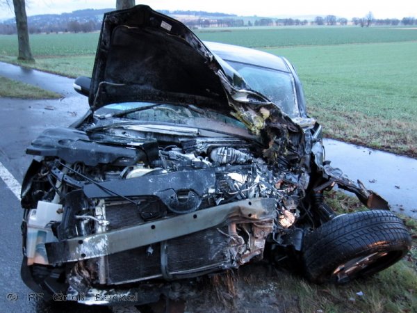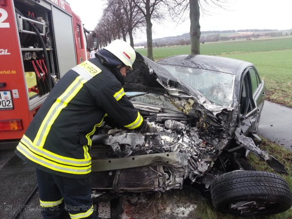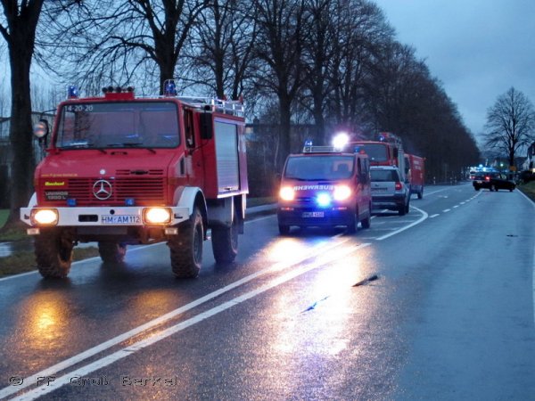 Nahezu genau 12 Stunden nachdem die Ortswehr ihren letzten Einsatz beendet hatte wurden die Groß Berkeler Einsatzkräfte erneut von der Kooperativen Regionalleitstelle Weserbergland zu einem Verkehrsunfall alarmiert. Diesmal schien es aber gleich auf den ersten Blick um einiges ernster zu sein, da außer den Meldeempfängern auch die Sirenen ausgelöst wurden. Und auch die erste Meldung verhieß zunächst nichts Gutes: THilfe VU eingeklemmte Person, PKW brennt.