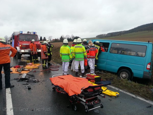 Schnellstmöglich sind daraufhin die Kameraden zum Feuerwehrhaus geeilt und schon kurze Zeit nach der Alarmierung fuhren die ersten Fahrzeuge die Einsatzstelle an. Dort angekommen machte sich aber gleich eine gewisse Erleichterung breit: Zwar sah die Unfallstelle deutlich schlimmer aus als noch in der Nacht zuvor: Ein PKW und ein Kleinbus waren frontal zusammengestoßen und die Fahrerin des Kleinbusses war in ihrem Fahrzeug eingeklemmt. Doch konnte zumindest kein Feuer erkannt werden! Und da schon Rettungswagen und ein Notarzteinsatzfahrzeug vor Ort eingetroffen waren, wurden die Verletzten bereits betreut und medizinisch versorgt.