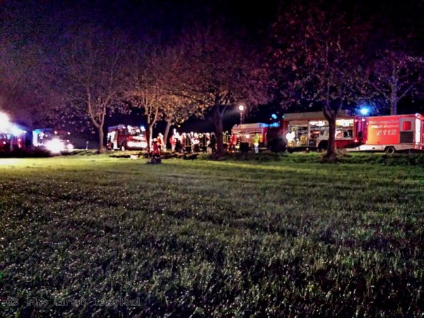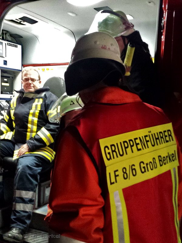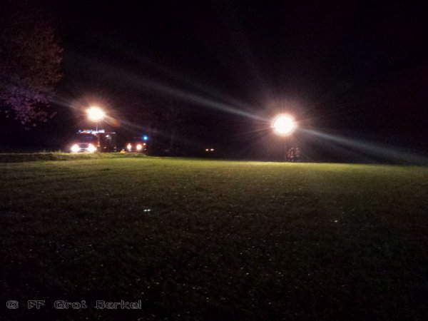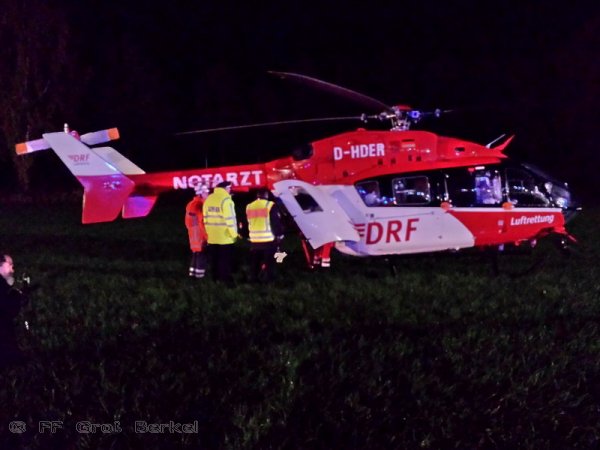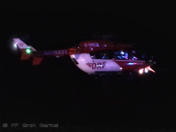 Zur Ausleuchtung des Landeplatzes auf einem Acker neben der Landesstraße kam nun die Feuerwehr Groß Berkel zum Einsatz. Außerdem bereiteten die Kameraden zur Sicherung einen dreiteiligen Löschangriff mit Wasser, Schaum und Pulverlöscher vor.