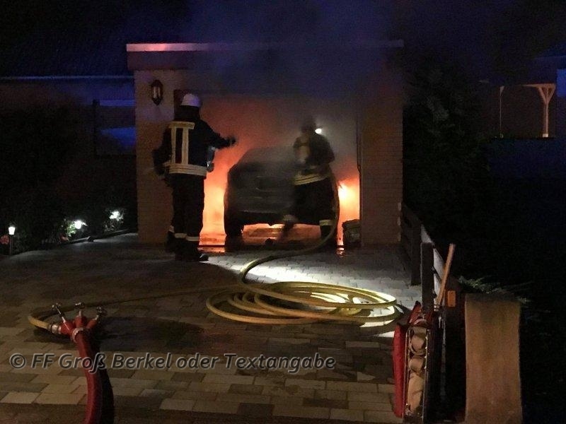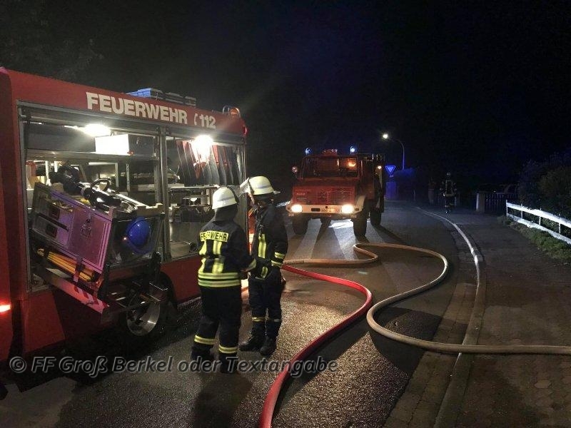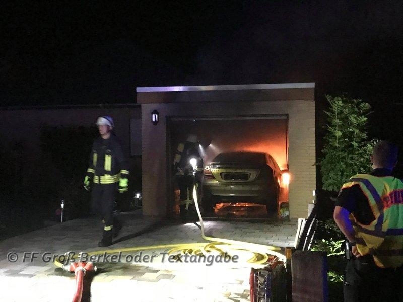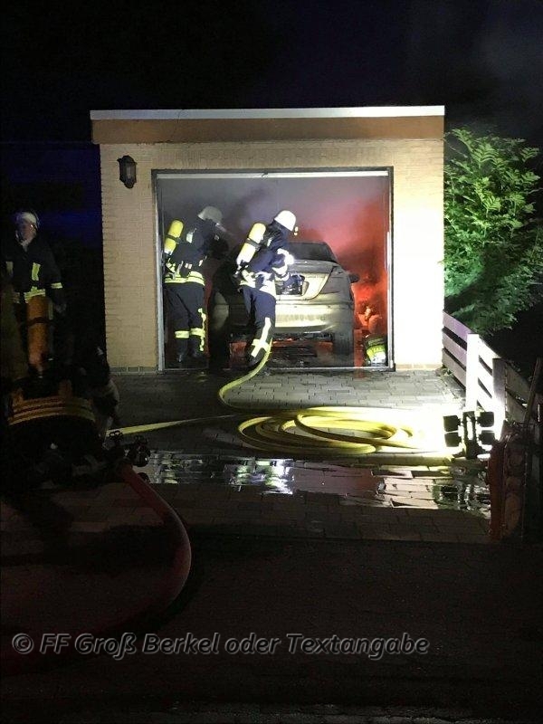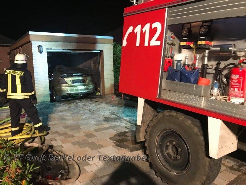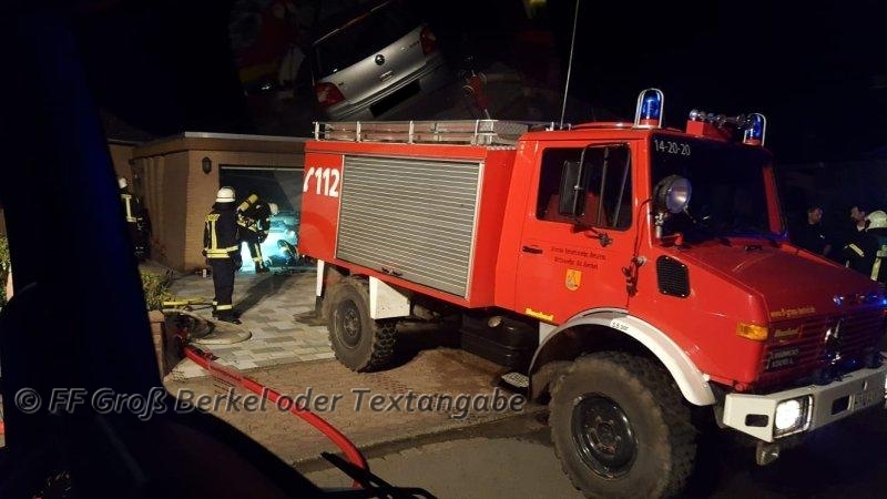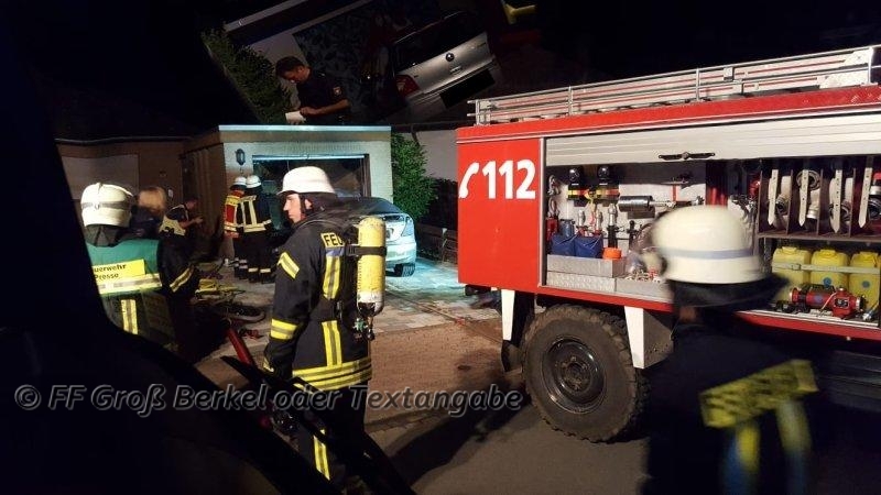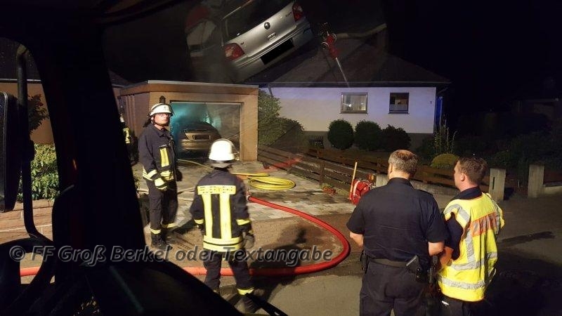 Am Sonntag, dem 10.06.2018, wurde die Feuerwehr Groß Berkel nachts um 0:48 Uhr mit dem Alarmstichwort "FEU Garage, brennt PKW in Garage" in die Straße Am Sportplatz alarmiert.