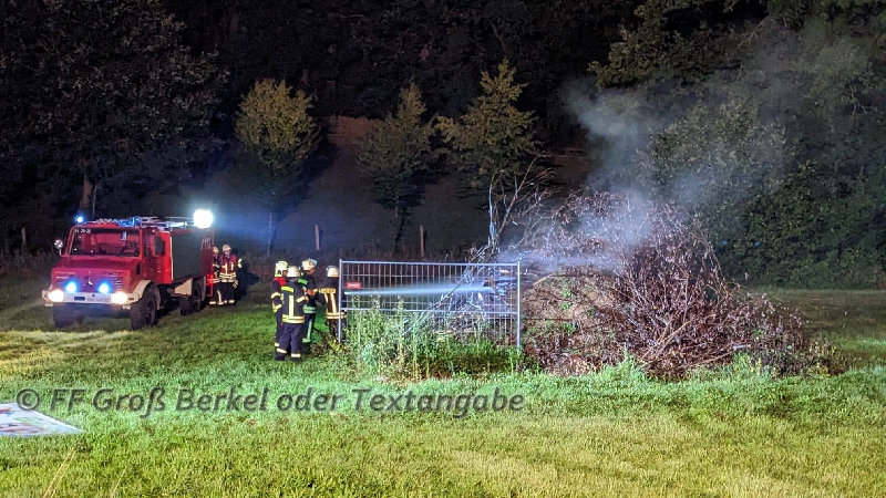 Vor Ort wurde ein an zwei Stellen brennender Haufen aus Erde und Schnittresten festgestellt. Durch das TLF8W wurde der Schnellangriff zum löschen vorgenommen. Nachdem das Feuer aus war, wurde der Haufen durch einen Landwirt an den beiden betreffenden Stellen noch einmal angehoben, um sicher zu stellen, dass sich keine weiteren Glutnester im inneren befinden. Nachdem auch dies nicht der Fall war, konnten die Kräfte aus Groß Berkel die Einsatzstelle verlassen.