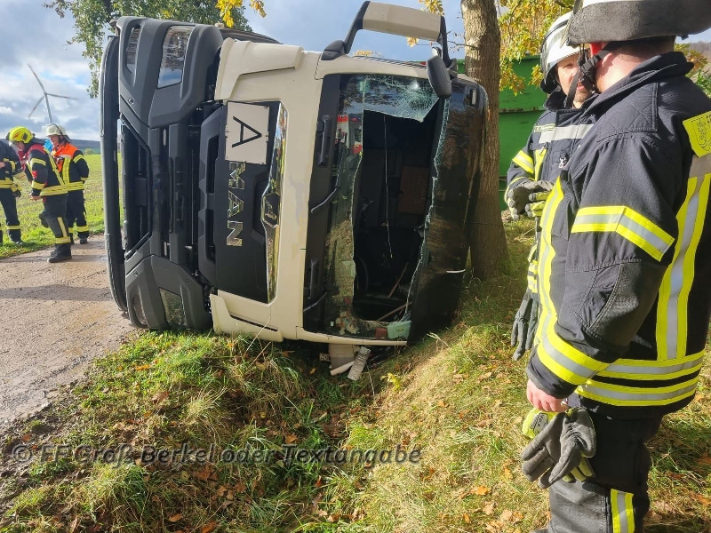 Bei eintreffen an der Einsatzstelle, lag ein LKW auf der Seite. Dessen Fahrer war im LKW eingeschlossen und konnte sich nicht selbst befreien. Die ebenfalls alarmierte Ortswehr Aerzen führte daher eine technische Rettung durch und entfernte die Frontscheibe. Die Kameraden aus Groß Berkel klemmten derweil die Batterie ab und fingen auslaufende Betreibsstoffe auf. Desweiteren blieb ein Teil in Bereitstellung, um die Kräfte aus Aerzen ggf. bei der technischen Rettung zu unterstützen.
