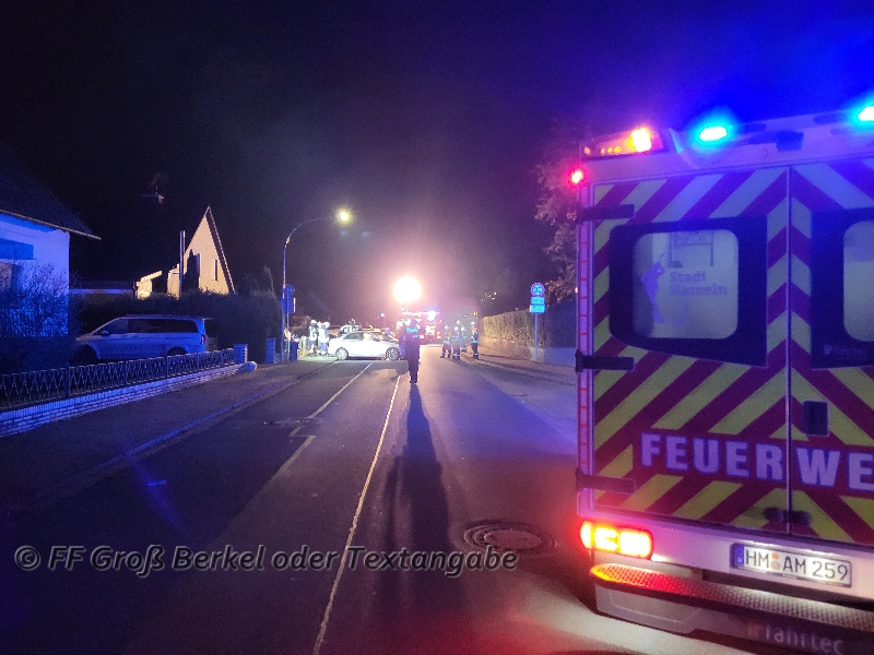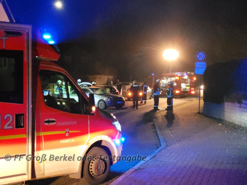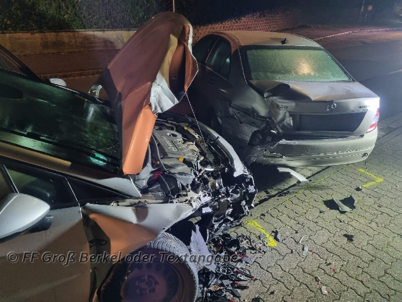 Diese Meldung bestätigte sich nach Ankunft an der Einsatzstelle. Ein Opel-Kombi war auf eine stehende Mercedes-Limousine aufgefahren. Die Kräfte aus Groß Berkel leuchteten die Unfallstelle aus, öffneten die Motorhaube gewaltsam und klemmten die Batterie ab. Hierzu wurde die Straße voll gesperrt. Nach kurzer Zeit konnte die Fahrbahn wieder halbseitig freigegeben werden. Durch die Kameraden wurde der Verkehr in Amtshilfe geregelt. Nach der Unfallaufnahme durch die Polizei, konnten die Kameraden die Fahrbahn wieder freigeben und die Einsatzstelle verlassen.