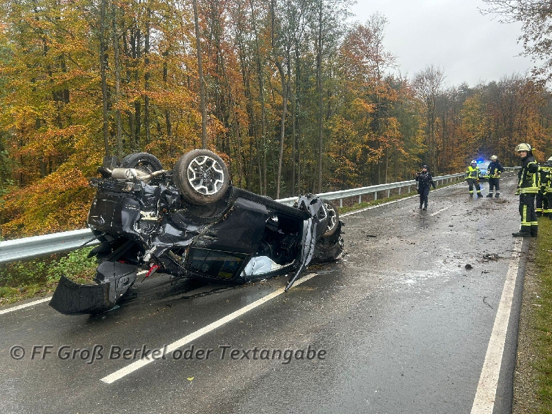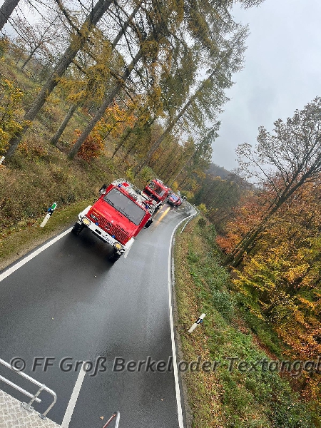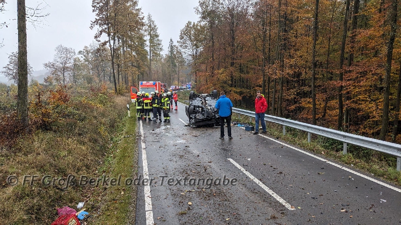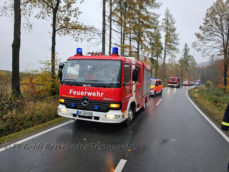 Bereits kurz nach der Alarmierung machten sich die Feuerwehren aus Groß Berkel, Aerzen und Grupenhagen auf den Weg zum Einsatzort. Vor Ort stellte sich heraus, dass sich die Einsatzstelle in einem Waldstück vor Bösingfeld befand. Da sich der Unfallort also im Gebiet des Bundeslandes Nordrhein-Westfalen befand, wurde zusätzlich die Polizei der Gemeinde Extertal nachgefordert. Beim Eintreffen des Kommandowagens war die zunächst als eingeklemmt vermutete Person bereits von einer Ersthelferin aus dem demolierten Fahrzeug befreit worden. Glücklicherweise war zufällig außerdem schon die Besatzung eines Krankentransportwagens vor Ort, welche zunächst die medizinische Versorgung und Betreuung der verunfallten Person übernahm. Das Fahrzeug war auf dem Dach liegend zum stehen gekommen, weshalb sich das Abklemmen der Fahrzeugbatterie als schwierig herausstellte. Die Maßnahmen der Feuerwehr Groß Berkel beschränkten sich daher auf die Unterstützung bei den Aufräumarbeiten am Unfallort, welcher mit Trümmerteilen bedeckt war. Die Straßenoberfläche wurde gereinigt und das Fahrzeug durch ein Abschleppunternehmen abtransportiert.