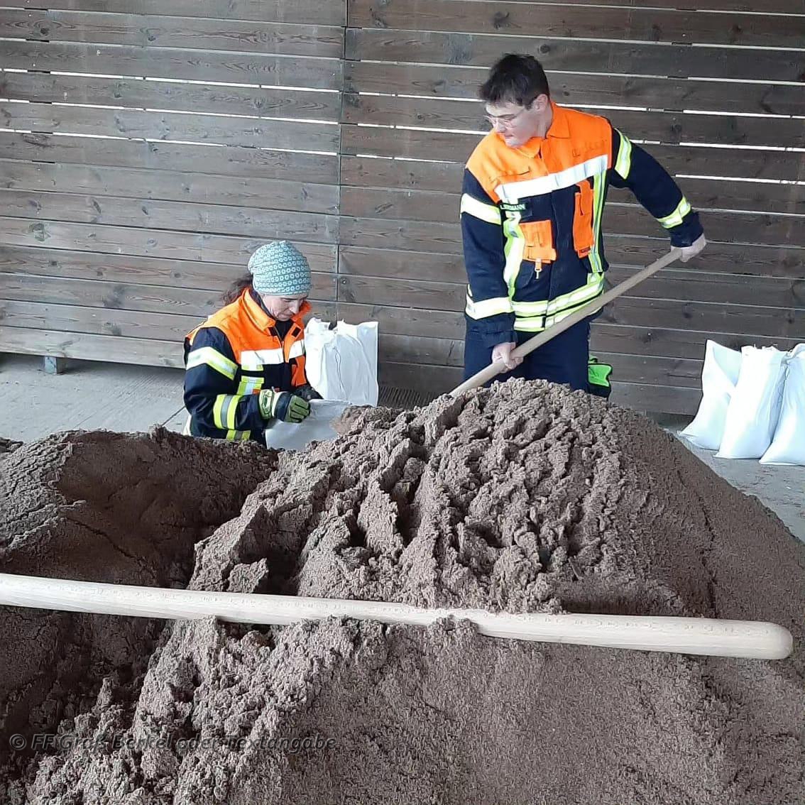Nach einer Lageeinweisung begannen alle Einsatzkräfte mit der Befüllung und Verladung von 15000 Sandsäcken mit 160 Tonnen Sand. Verpflegung bekamen wir dabei durch die Kameraden der Versorgungsgruppe.